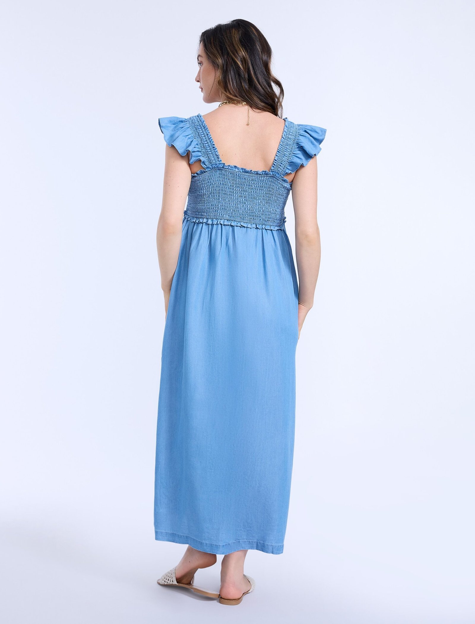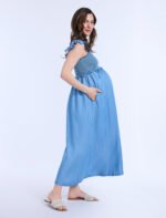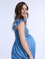 Flowy, feminine, and effortlessly chic, the Sleeveless Ruffle Shoulder Smocked Dress is a must-have for every stage of pregnancy. Designed with a flattering square neckline and delicate ruffle shoulders, it exudes timeless charm. The smocked chest provides a comfortable, flexible fit, while the maxi silhouette offers an elegant look perfect for any occasion.