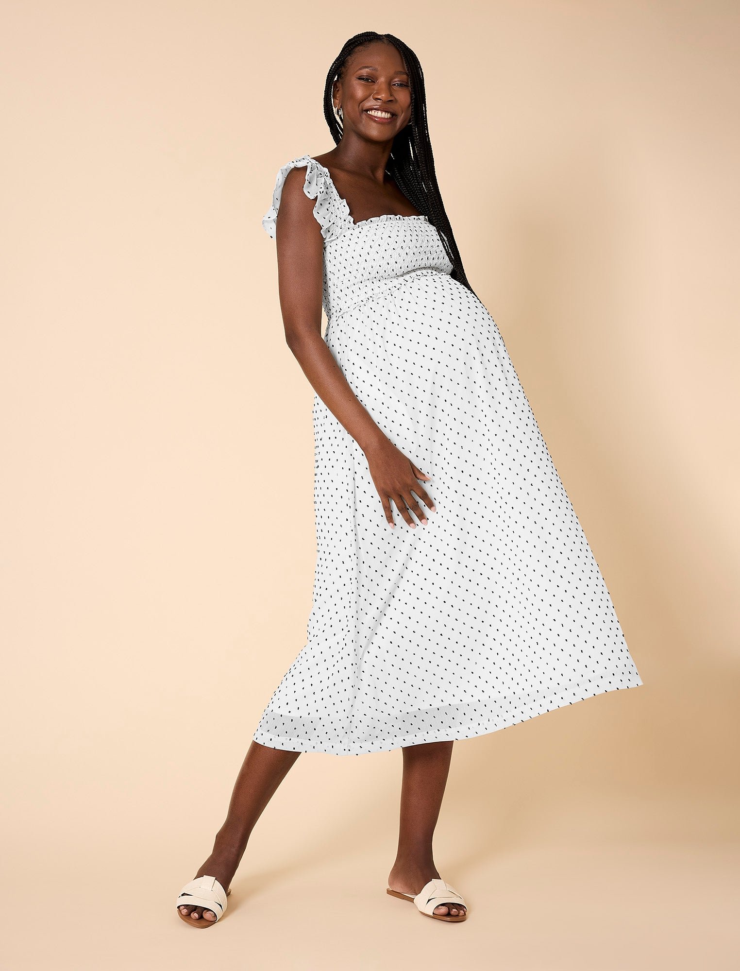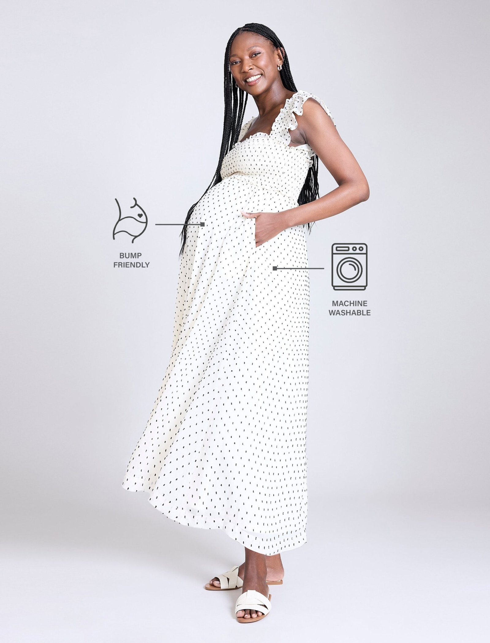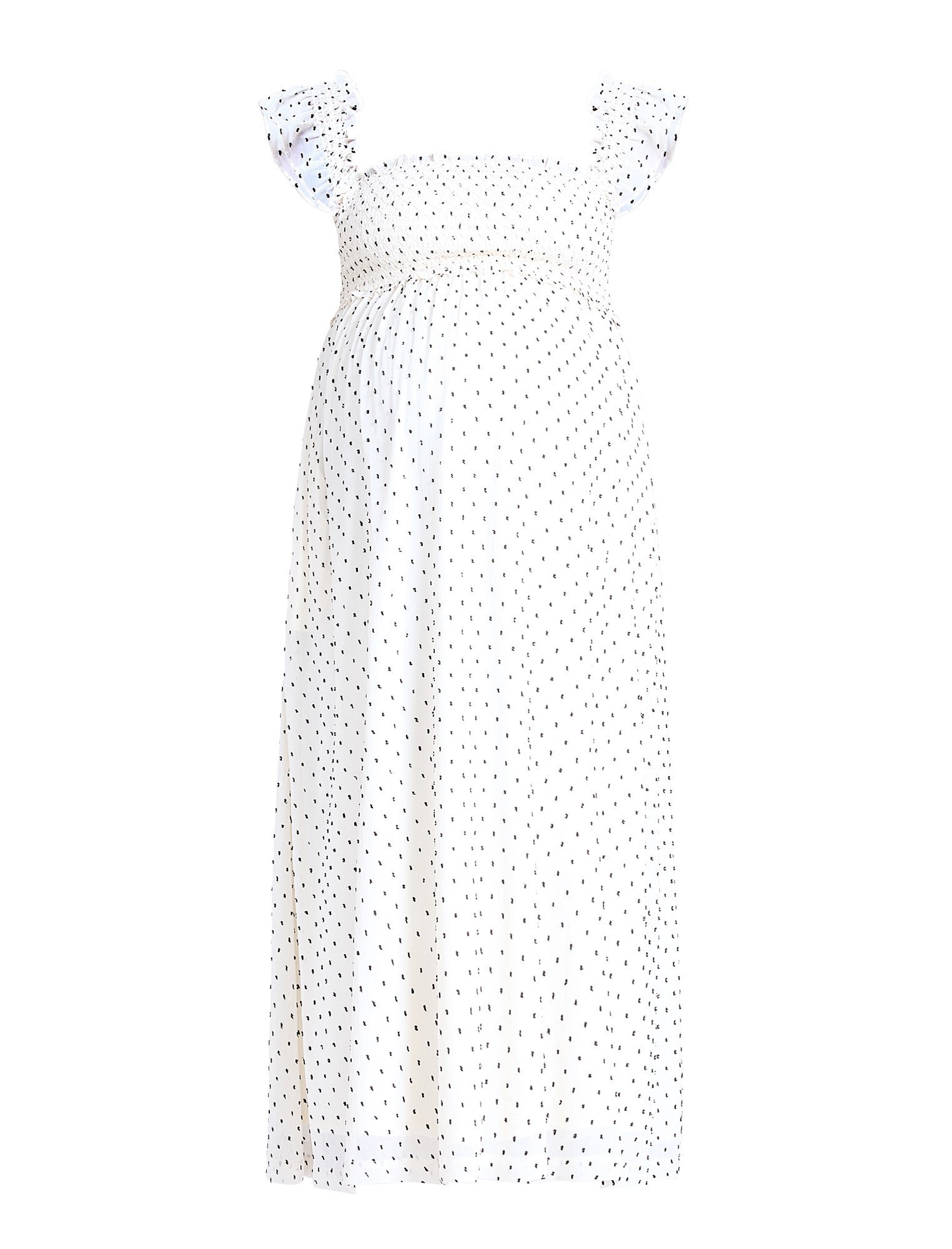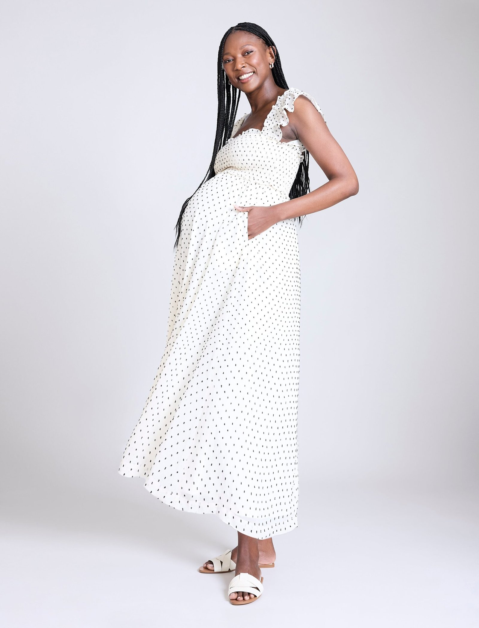 Flowy, feminine, and effortlessly chic, the Sleeveless Ruffle Shoulder Smocked Dress is a must-have for every stage of pregnancy. Designed with a flattering square neckline and delicate ruffle shoulders, it exudes timeless charm. The smocked chest provides a comfortable, flexible fit, while the maxi silhouette offers an elegant look perfect for any occasion.